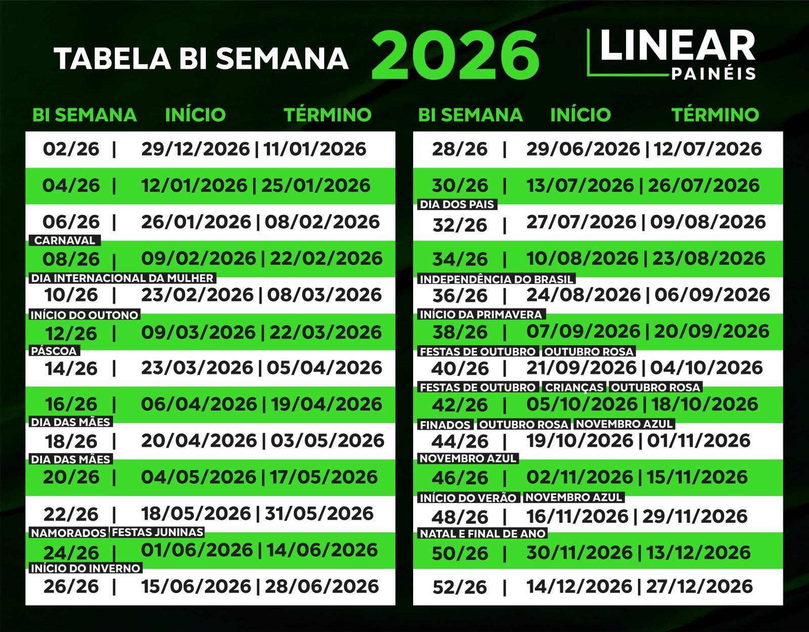 Tabela de BI SEMANAS